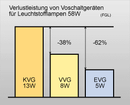 VVG Seit Mitte der neunziger Jahre weden in der Intustrie vorwiegend induktiv arbeitende verlustarme Vorschaltgeräte (VVG) verwendet. Diese sind mit Vorheizstrom, Zündspannung und Lampenstrom exakt auf den optimalen Lampenbetrieb abgestimmt. Verlustarme Vorschaltgeräte nehmen etwa ein Drittel weniger Leistung auf als Standard- Vorschaltgeräte. Gewünschter Nebeneffekt beim Einsatz von VVG's ist eine geringere Eigenerwärmung der Leuchte. Daraus resultiert ein geringerer Energieverbrauch.